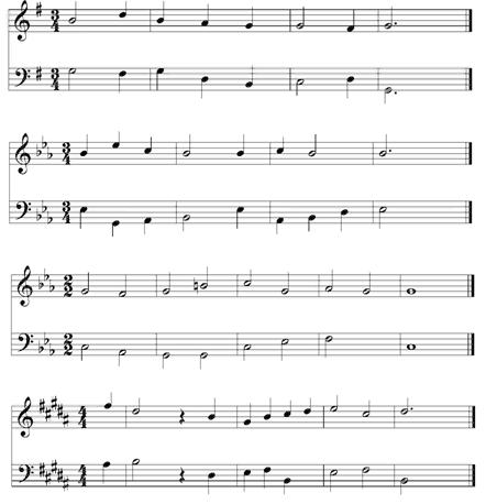 17. Codifique los sonidos de las melodías siguientes, según los principios de la armonización en bloques acordales a cuatro voces.
