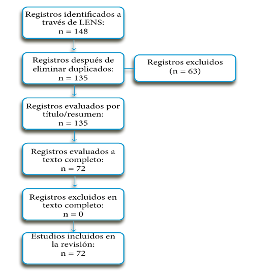 En esta fase, no se realizaron nuevas exclusiones, ya que todos los documentos accesibles cumplían con los criterios de inclusión. El proceso culminó con la inclusión de 72 trabajos académicos en la síntesis cualitativa y bibliométrica de esta revisión. El diagrama de flujo que detalla este proceso se presenta en la Figura 1.