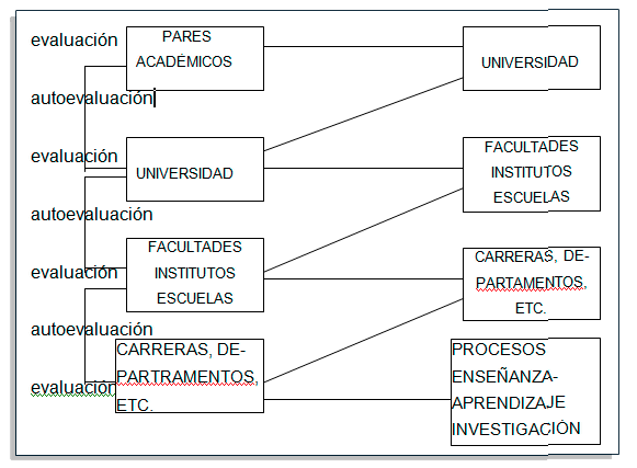 De esta manera, por ejemplo, si los sujetos que intervienen en la evaluación del nivel facultativo proceden del nivel central, entonces estos pueden ser reconocidos como evaluadores externos, aún cuando pertenezcan a la misma institución universitaria; de este modo el proceso de evaluación y no de autoevaluación. Lo mismo ocurriría para el caso en el que el nivel facultativo decida evaluar una carrera, programa, etc. Y así sucesivamente.