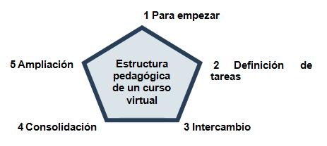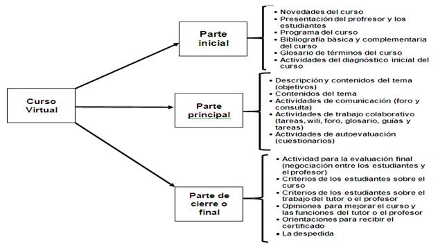Independientemente de la plataforma elegida, un curso virtual debe generalmente tener, desde lo tecnológico y didáctico- metodológico, una estructura como la que se muestra en la figura 4.