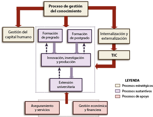 Se identifican cuatro procesos sustantivos: formación de pregrado; formación de postgrado; investigación, innovación y producción; extensión universitaria