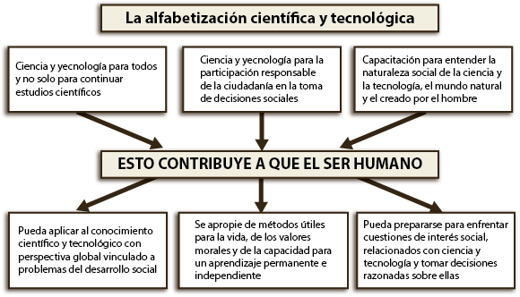 A continuación presentamos una esquematización del investigador Valdés Castro, para llegar a una alfabetización científica y tecnológica, es necesario, no solo interpretar, sino comprender y ejecutar en los ambientes de clases por parte de los profesores de manera interdisciplinaria las dimensiones que muestra el siguiente esquema, lo que contribuye al logro de un egresado en cualquiera de los niveles que se plantea en este trabajo a un mejoramiento profesional y humano acorde a las necesidades sociales que exige la agenda del siglo XXI.