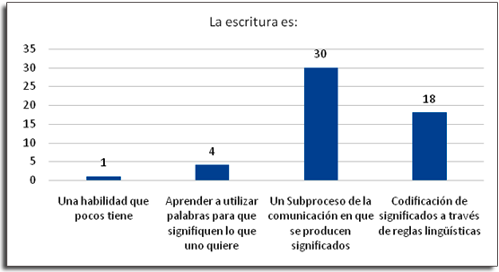 Entre los hallazgos se encontró que los estudiantes conciben la lectura y la escritura como una herramienta de información y comunicación, que les permite conseguir un fin y desconocen que leer y escribir son procesos que por sí mismos tienen importancia y trascendencia en la vida de las personas. En el gráfico 1, además deevidenciarsela práctica de la escritura como un acto comunicativo también revela la concepción de la escritura como una acción mecánica de codificación significados a través de reglas ortográficas; lo que permite inferir que tal vez estas creencias resultado de su proceso educativo y cultural son las que se manifiestan en sus actitudes y comportamientos frente a considerar que leer y escribir en la universidad son actividades aburridas, a la resistencia de un gran número de estudiantes para escribir un texto académico, a reducir la escritura a copiar y pegar textos pasándolos por propios y a rebajar el proceso de escritura en plasmar en una hoja las ideas y conocimientos que recupera de la memoria al pensar en determinado tema sin tener claridad sobre cuál es su intención de escritura y el público al que va a dirigirse.