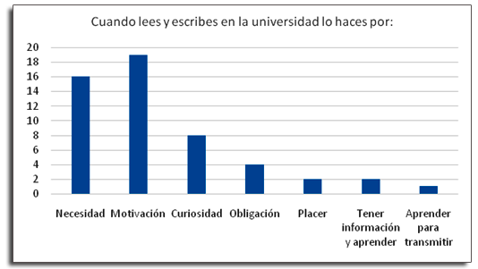 En el gráfico 2 que representa las razones por las cuales los estudiantes leen y escriben en la universidad, la mayoría de los estudiantes manifiestan que lo hacen por motivación y otro gran porcentaje dice que lo hace por necesidad; sin embargo, estas confidencias se contrastan con las respuestas que dan los mismos estudiantes acerca de los motivos para los cuales leyó y escribió, pues sus expresiones fueron leí para buscar respuestas a preguntas planteadas por el profesor, lo que muestra que la lectura no fue hecha por motivación propia sino por cumplir con una actividad académica. De manera similar, los estudiantes afirman que en la universidad se escribe para que los estudiantes aprendan a realizar el tipo de escritos que utilizarán como profesionales.