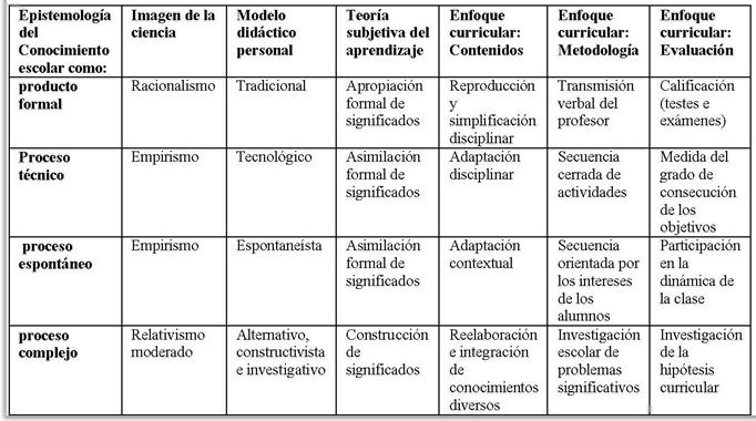 En la generación de estas concepciones epistemológicas, los autores han considerado seis dimensiones o categorías de conocimiento: 1) imagen de la ciencia, 2) modelo didáctico, 3) teoría del aprendizaje y elementos del currículo en que distinguen tres sub-categorías: 4) contenidos, 5) metodología y 6) evaluación. La tabla 1 muestra los valores generados por el cruce de las categorías con las concepciones epistemológicas sobre el conocimiento escolar referidas.