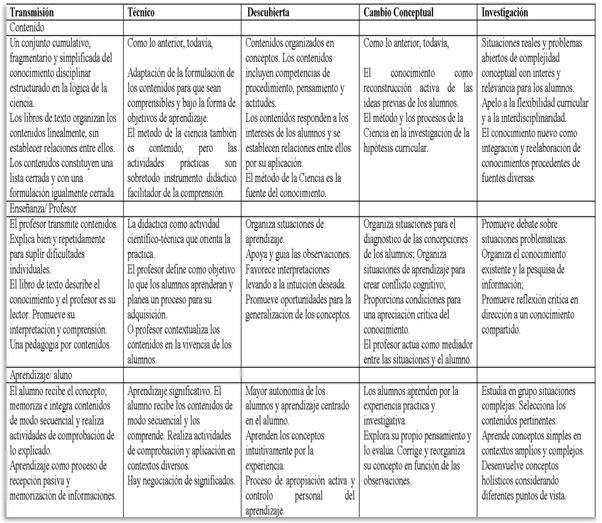 Cachapuza Praia J., Jorge M. [6], [7] delinean un modelo compuesto por cuatro “perspectivas de enseñanza de las ciencias” que caracterizan considerando cuatro vertientes: epistemológica, sociológica, psicológica y didáctico-pedagógica. Todavía, en la síntesis que se presenta apenas se hace referencia a las características pedagógicas y didácticas.