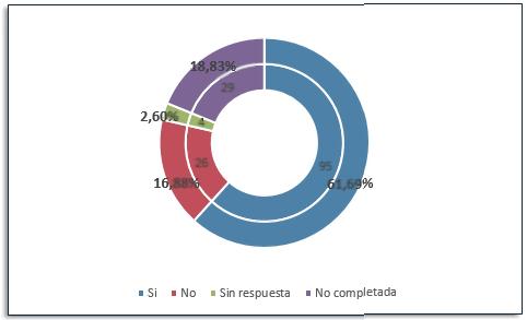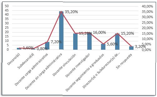 Interpretación: El rol de mayor presencia en los participantes en la encuesta a docentes de la institución fue el de docente sin carga administrativa con un 35,20%, seguido de los docentes investigadores y de los docentes con responsabilidad en vinculación con el 16,00% y 15,20% respectivamente. Este nivel de participación recoge la presencia de docentes que se desempeñan en las tres funciones sustantivas con un 66,40% del total de la muestra encuestada.