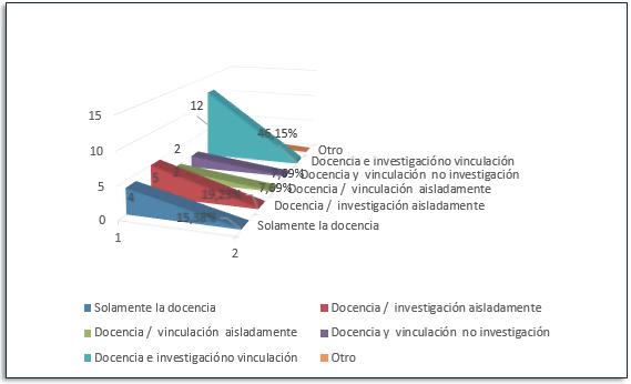 Interpretación: Para quienes consideraron que no existe la presencia de las tres funciones sustantivas en su cátedra, su criterio se ve reflejado en que el 46,15% estima que solamente se ponen en práctica la docencia e investigación pero no la vinculación con la sociedad, un 19,38% piensa que está presente solo el ejercicio docente y que la investigación se hace aisladamente sin contar con la vinculación con la sociedad y un 15,38% considera que se manifiesta solamente la docencia sin contar con la investigación y la vinculación con la sociedad.