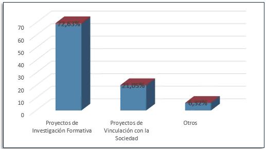 Interpretación: De los docentes que creen que las tres funciones se hacen presentes en su cátedra, el 72,63% valora que la vía por la cual se manifiestan las tres funciones sustantivas es a través de los proyectos de investigación formativa, mientras que un 21.05% opina que dicha articulación se hace efectiva por medio de proyectos de vinculación con la sociedad.