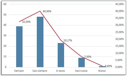 Interpretación: En cuanto a la inclusión de actividades de investigación y vinculación con la sociedad en la planificación microcurricular por parte del docente, el 40,00% hace constar que casi siempre las contemplan en su sílabo, el 32,50% lo hace permanentemente y el 19,17% incluye este tipo de actividades solo de manera ocasional.