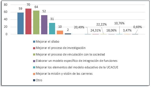Interpretación: Como posibles vías para el mejoramiento de la integración de las funciones sustantivas, un 24,31% considera que se podría alcanzar con el mejoramiento de los procesos de investigación que lleva adelante la Universidad Católica de Cuenca (Investigación Científica, Investigación Formativa e Investigación Aplicada); un 22,22% estima que sería posible a través de la mejora en los procesos de la vinculación con la sociedad, mientras que un 18,06% piensa que una solución viable a esta problemática estaría en la elaboración de un modelo específico para la integración de las funciones sustantivas al interior de la institución.